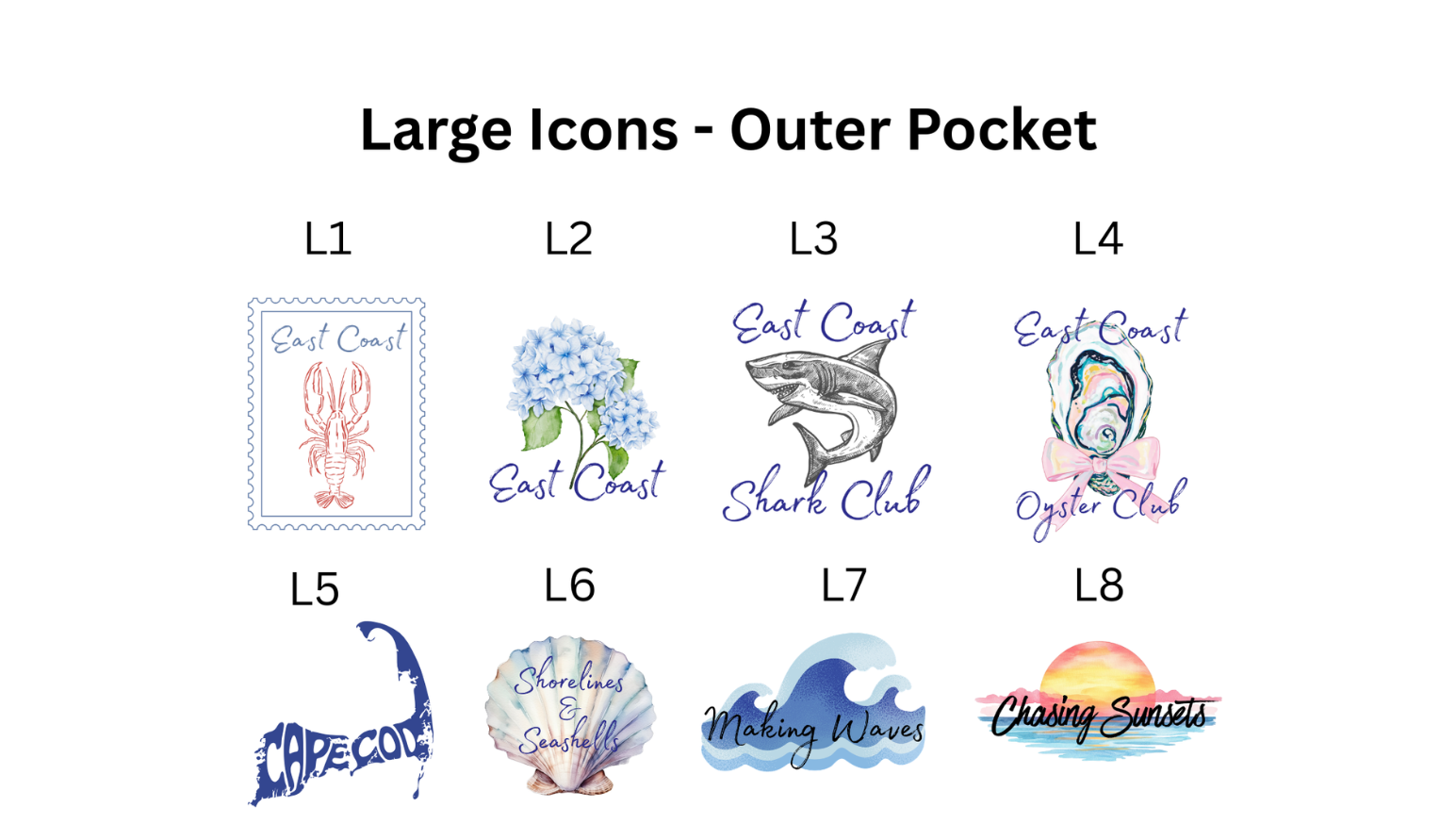 You may choose up to 5 icons for your tote. Type the code for the icon you want in that spot. Example: Icon 1 - C5 (would be the anchor in spot #1 in the picture)