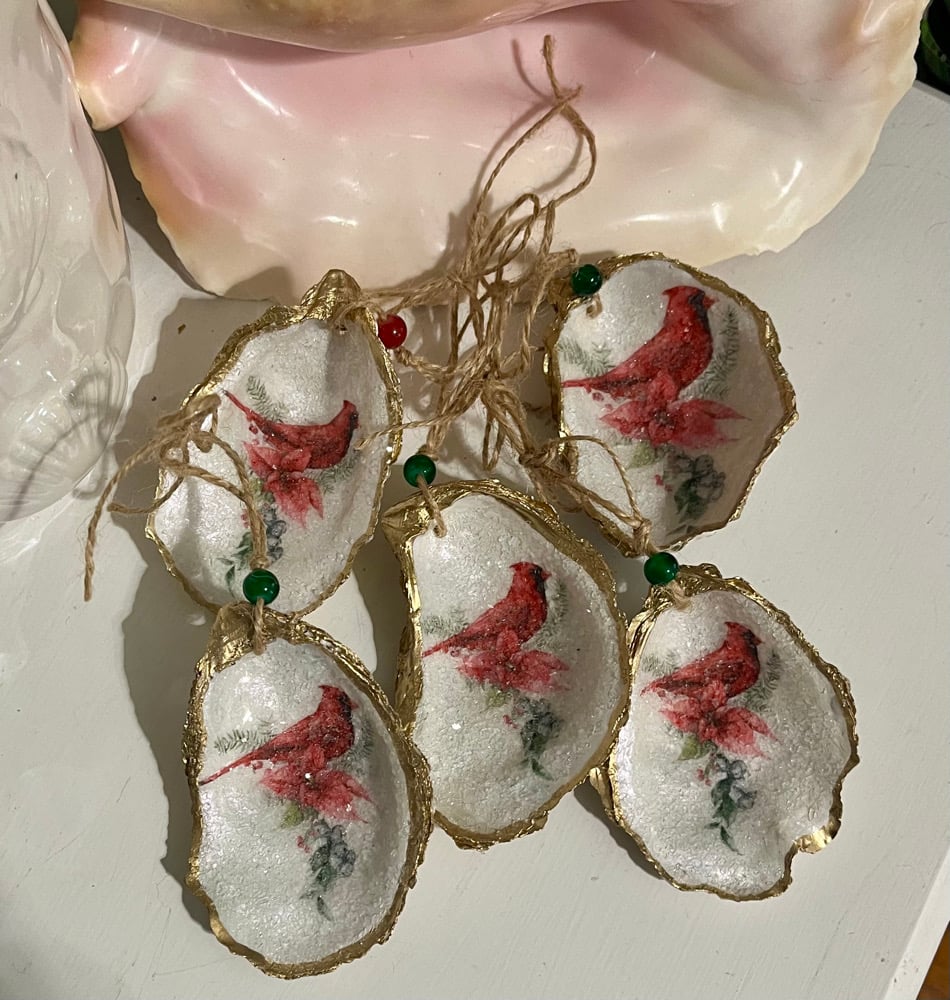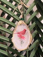 Beautiful cardinal on an oyster shell. Finished with diamond dust for a sparkling touch!