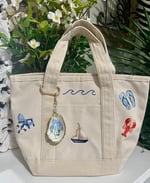This Cape Cod small tote bag is perfect for everyday use! Features five icons that give that Cape Cod feel! Add some bag charms to make it your own!