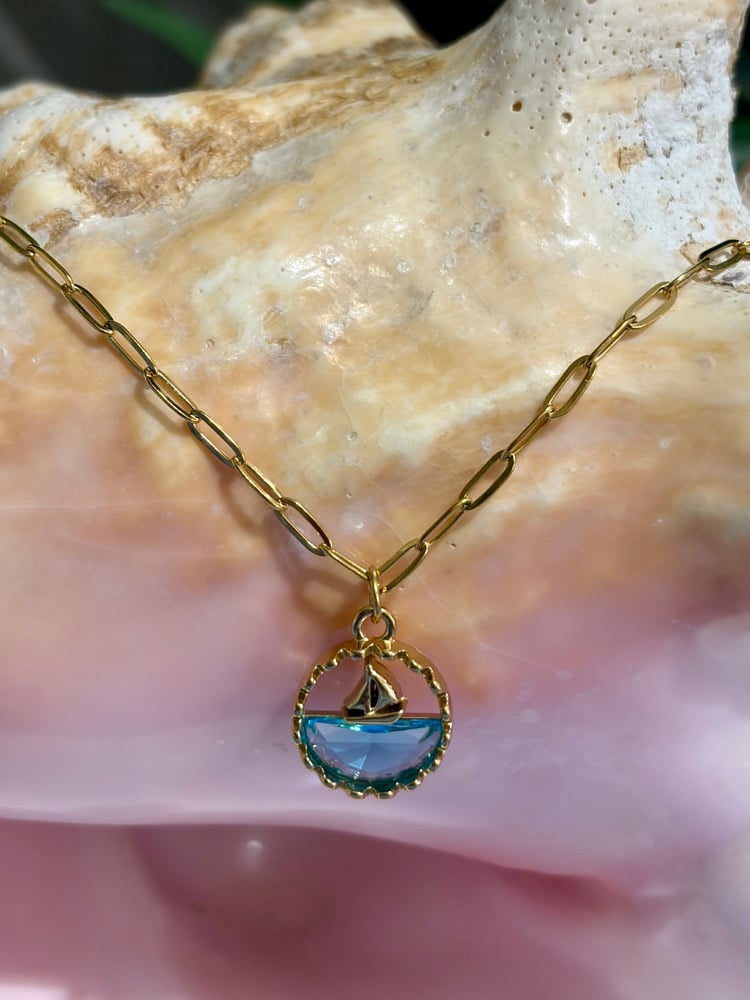 Beautifully detailed pendant of a sailboat on the ocean.